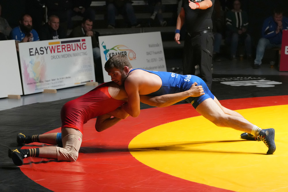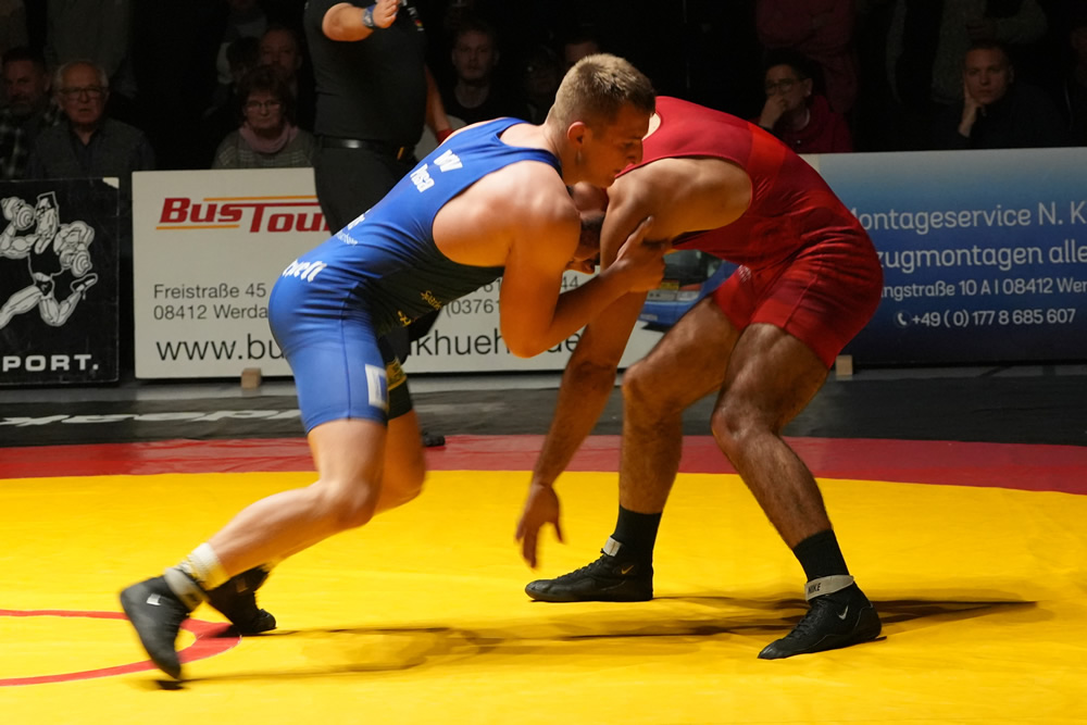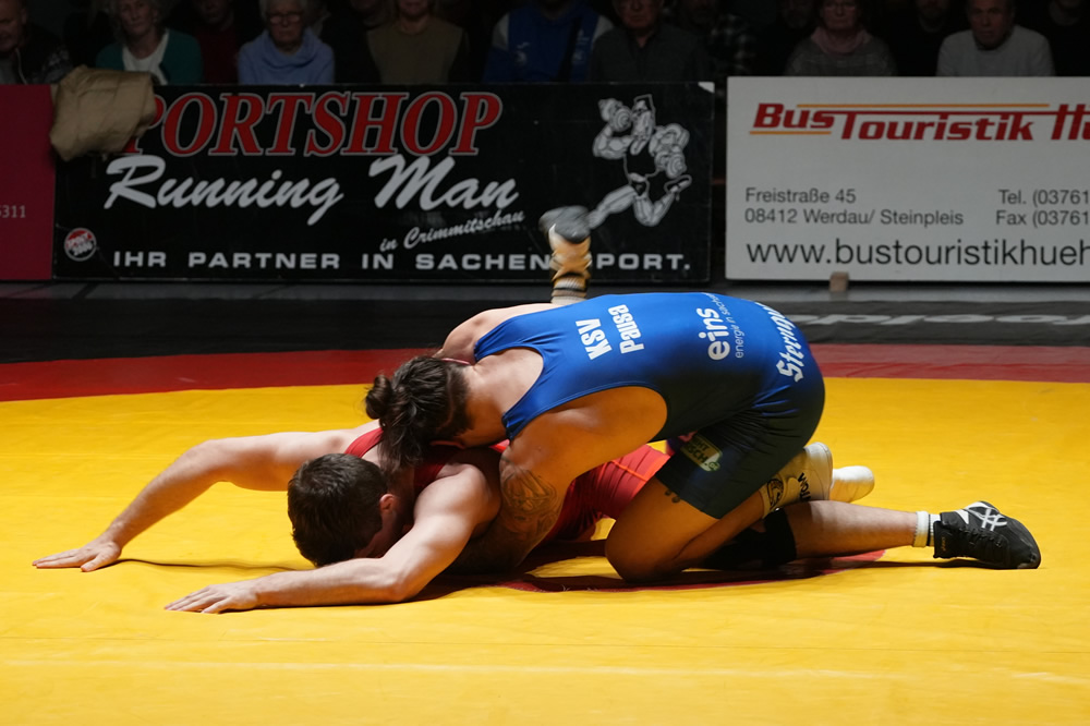 Zhalavdi Sokuev (61 kg/GR) stand beim 4:22 gegen Dominik Gasser auf verlorenem Posten. Den ersten Mannschaftspunkt für die Vogtländer holte Michal Bielawski (130 kg/FR) durch einen 2:1-Sieg über den Deutschen Vizemeister Ilja Matuhin für die WKG. Jacub Kesy (66 kg/FR) legte einen 8:1-Sieg über Konstantin Valassis nach, Pausa/Plauen damit den Gastgebern wieder dicht auf den Fersen. Doch dann waren die Westsachsen wieder am Zug, David Adler (98 kg/GR), der Artsiom Shumski vertrat, verlor gegen Marten Scheel mit 1:5 Zählern, kurz vor der Halbzeitpause hatte dann auch Sebastian Wagner (71 kg/GR) gegen Nataniel Troczynski mit 2:6 Punkten das Nachsehen. So führte der AC Werdau zur Pause mit 8:3 Mannschaftspunkten.
