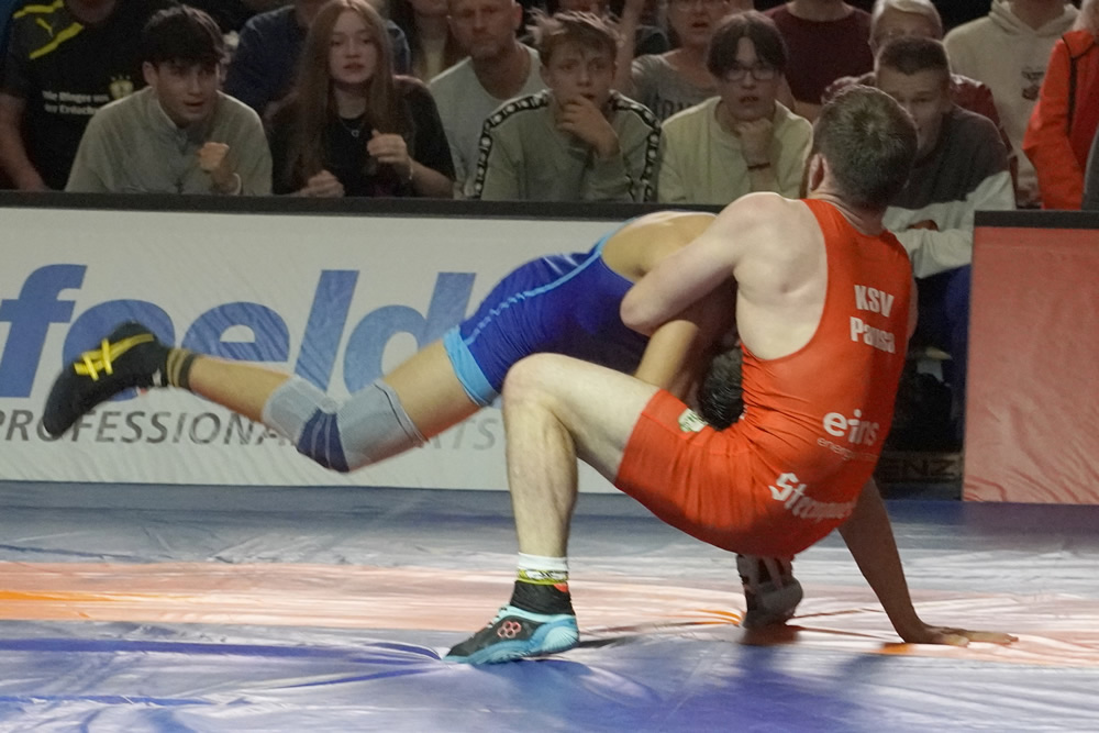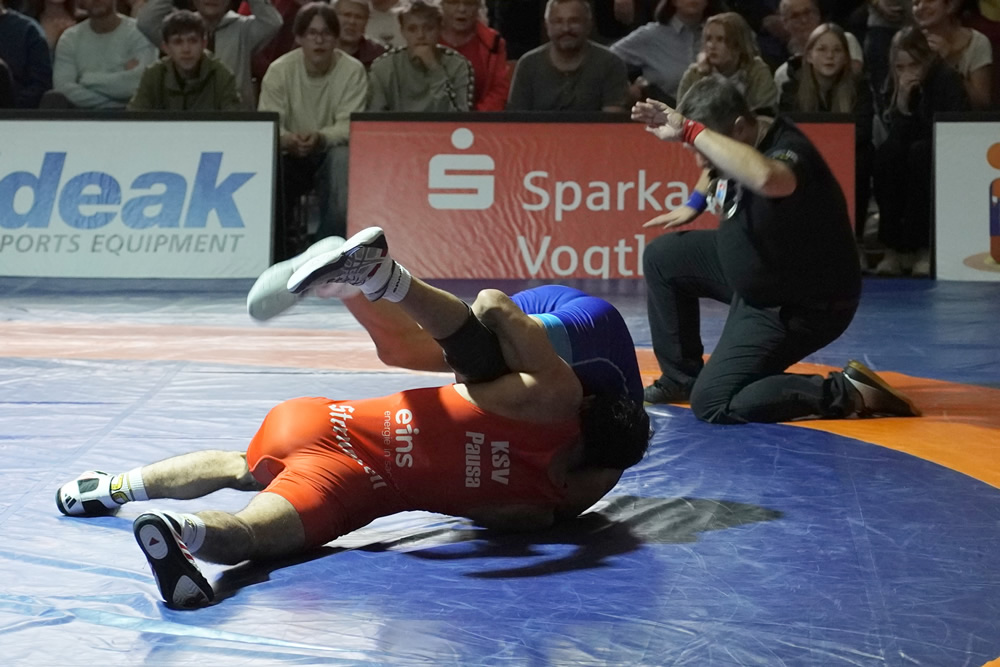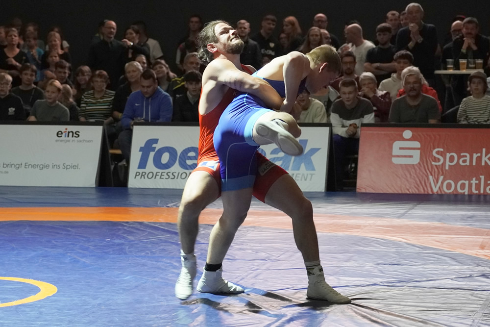 Den Auftakt machte Noorolah Ahmadi (61 kg/FR), der seine zweite Saison für die WKG kämpft. Der Berliner schulterte Werdaus Malik Yalcin, der ebenfalls aus Berlin kommt, nach nur 28 Sekunden, was die WKG-Fans bereits in beste Stimmung brachte. Die wurde auch nicht getrübt, als Artsiom Shumski im Schwergewicht (130 kg) in einem polnischen Duell gegen seinen 8 Kilo schwereren Landsmann Tomasz Wawrzynczyk mit 1:4 Punkten unterlag. Eine riesen Überraschung gab es im Limit bis 66 Kilo/GR, wo Youngster Carl Hocke den Werdauer Magomed Bekov mit 4:1-Punkten bezwang, was für Trainer Kevin Drehmann im Nachhinein ein entscheidender Sieg zum späteren Unentschieden war.