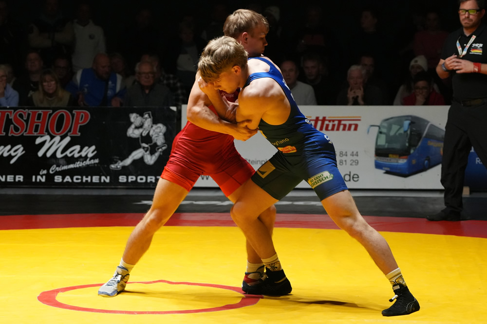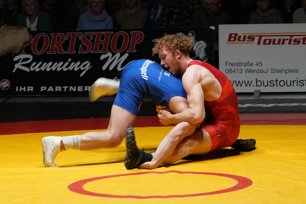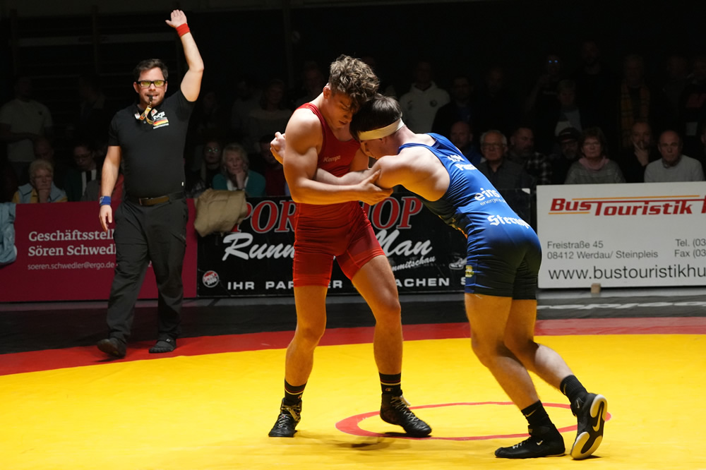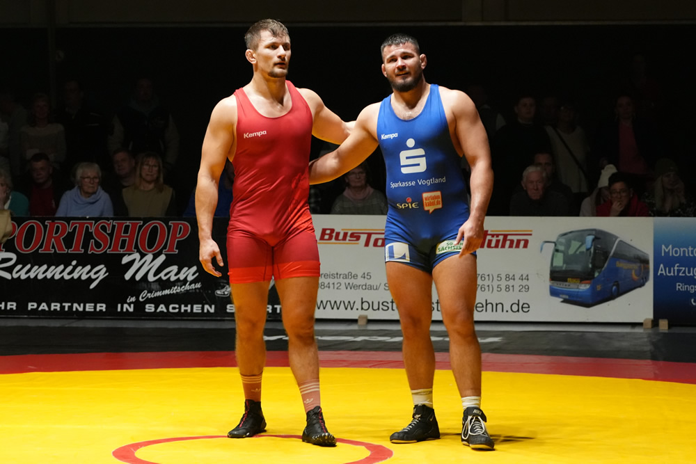 Zhalavdi Sokuev (61 kg/GR) stand beim 4:22 gegen Dominik Gasser auf verlorenem Posten. Den ersten Mannschaftspunkt für die Vogtländer holte Michal Bielawski (130 kg/FR) durch einen 2:1-Sieg über den Deutschen Vizemeister Ilja Matuhin für die WKG. Jacub Kesy (66 kg/FR) legte einen 8:1-Sieg über Konstantin Valassis nach, Pausa/Plauen damit den Gastgebern wieder dicht auf den Fersen. Doch dann waren die Westsachsen wieder am Zug, David Adler (98 kg/GR), der Artsiom Shumski vertrat, verlor gegen Marten Scheel mit 1:5 Zählern, kurz vor der Halbzeitpause hatte dann auch Sebastian Wagner (71 kg/GR) gegen Nataniel Troczynski mit 2:6 Punkten das Nachsehen. So führte der AC Werdau zur Pause mit 8:3 Mannschaftspunkten.